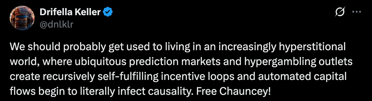 כנראה שאנחנו צריכים להתרגל לחיים בעולם שהופך להיפרסטיציונלי יותר ויותר, שבו שווקי חיזוי נפוצים ואמצעי היפר-הימורים יוצרים לולאות תמריצים המגשימות את עצמן באופן רקורסיבי, וזרימות הון אוטומטיות מתחילות לזהם את הסיבתיות עצמה. שחררו את צ’ונסי!