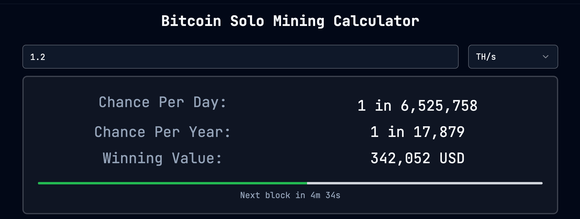 אתם בודאי כבר מבינים שעם המחשב הקטנטן הזה, פשפש קרקסים זעיר, קשה להתחרות נגד ה-pools המפלצתיים, אבל אנחנו לא מפחדים מדרך ארוכה. חישוב פשוט מראה את הסיכויים לזכייה: